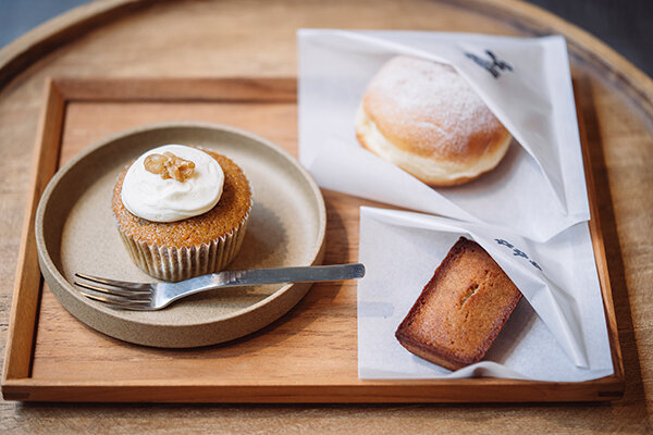 店内にはイートインスペースがあるので、コーヒーを食べながらおいしいお菓子を味わって。「キャロットケーキ」(写真左)は、スパイスや生姜の爽やかな香りとにんじんの甘みが織り交ざった複雑な味わい。「カスタードクリームドーナツ」(写真右上)や「焦がしバターのフィナンシェ」(写真右下)も人気です。