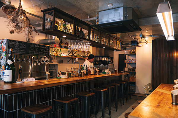常時8~10種類の樽生クラフトビールを炭焼き中心の料理とともに提供するビアバー。季節限定の特別なビールやさまざまな醸造法によって作られたビールを飲み比べることができます。壁にプロジェクターが投影された店内は落ち着いた雰囲気で、こどもやペット(犬・猫に限る)の入店も可能。