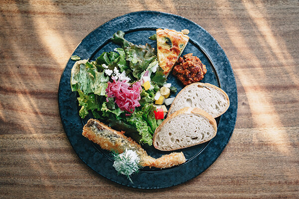 3種類のメイン料理の中から1種類を選べる「季節のplate」(1,300円)。今回は「サーモンフライ ヨーグルトハーブソース添え」を選びました。キッシュ、チリコンカン、サラダ、ピクルス、パンまたは麦飯が付いていて、どれをとっても手作りのやさしい味わい。彩り豊かで、見た目も楽しめるプレートです。