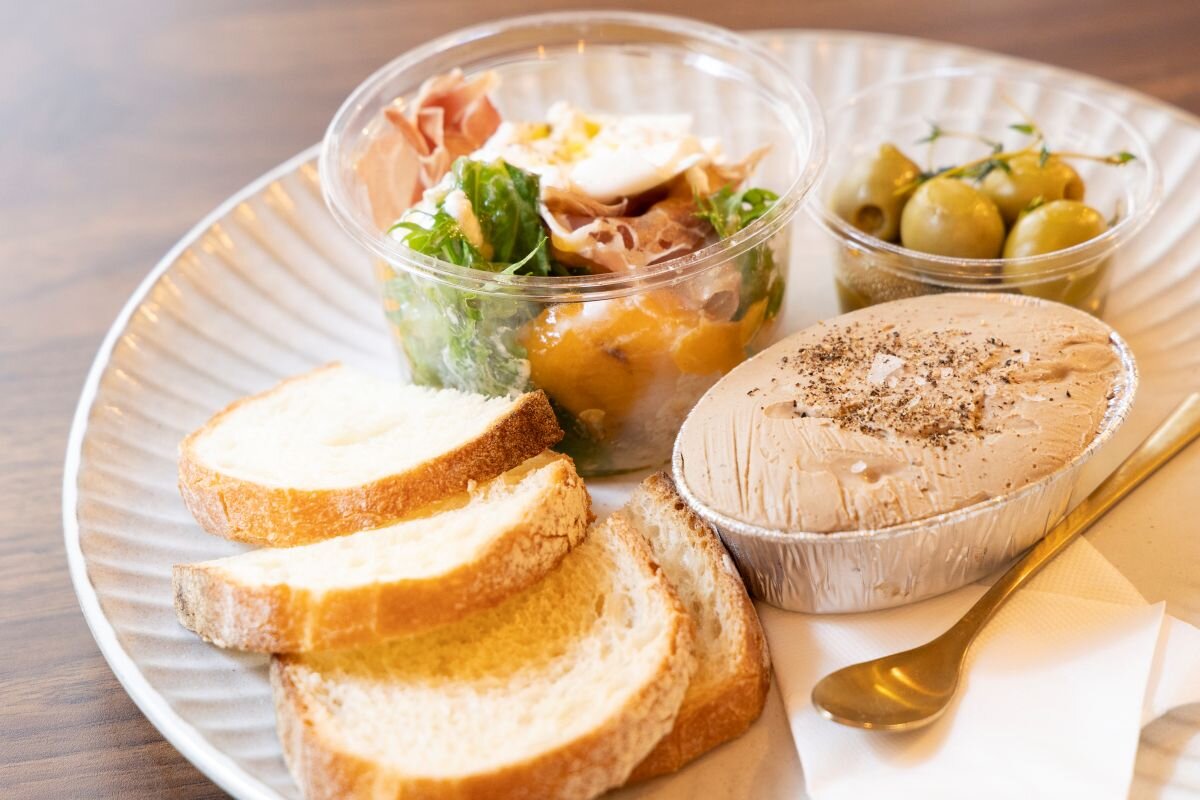 この日のおすすめ前菜は「発酵バターとレバーのパテ」(580円)、「柿のマリネとスペイン産生ハムとイタリア産ブッラータのサラダ」(690円)、「イタリアトスカーナ産アンチョビオリーブマリネ」(480円)。イートインの場合+100円でバゲットをつけて盛りつけてくれます。