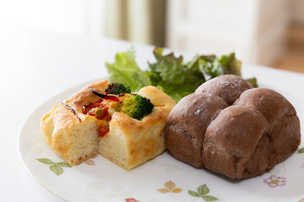 フォカッチャは野菜の彩りが美しく、チョコレートパンはふっくらと膨らんで、きれいにくっついています。