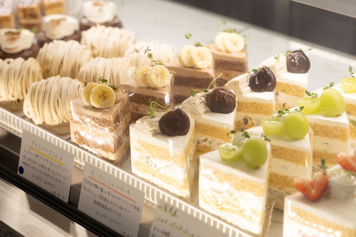シックでありながらかわいらしさも感じられる店内には、旬の素材を取り入れた美しいケーキのほか、レモンケーキやクッキーなどの焼き菓子が並びます。